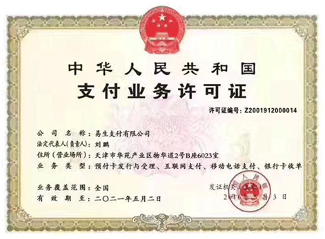 2011年5月18日,易生支付率先獲得中華人民共和國支付業(yè)務許可證,可開展“互聯(lián)網(wǎng)支付”和“預付卡發(fā)行與受理”兩項業(yè)務。